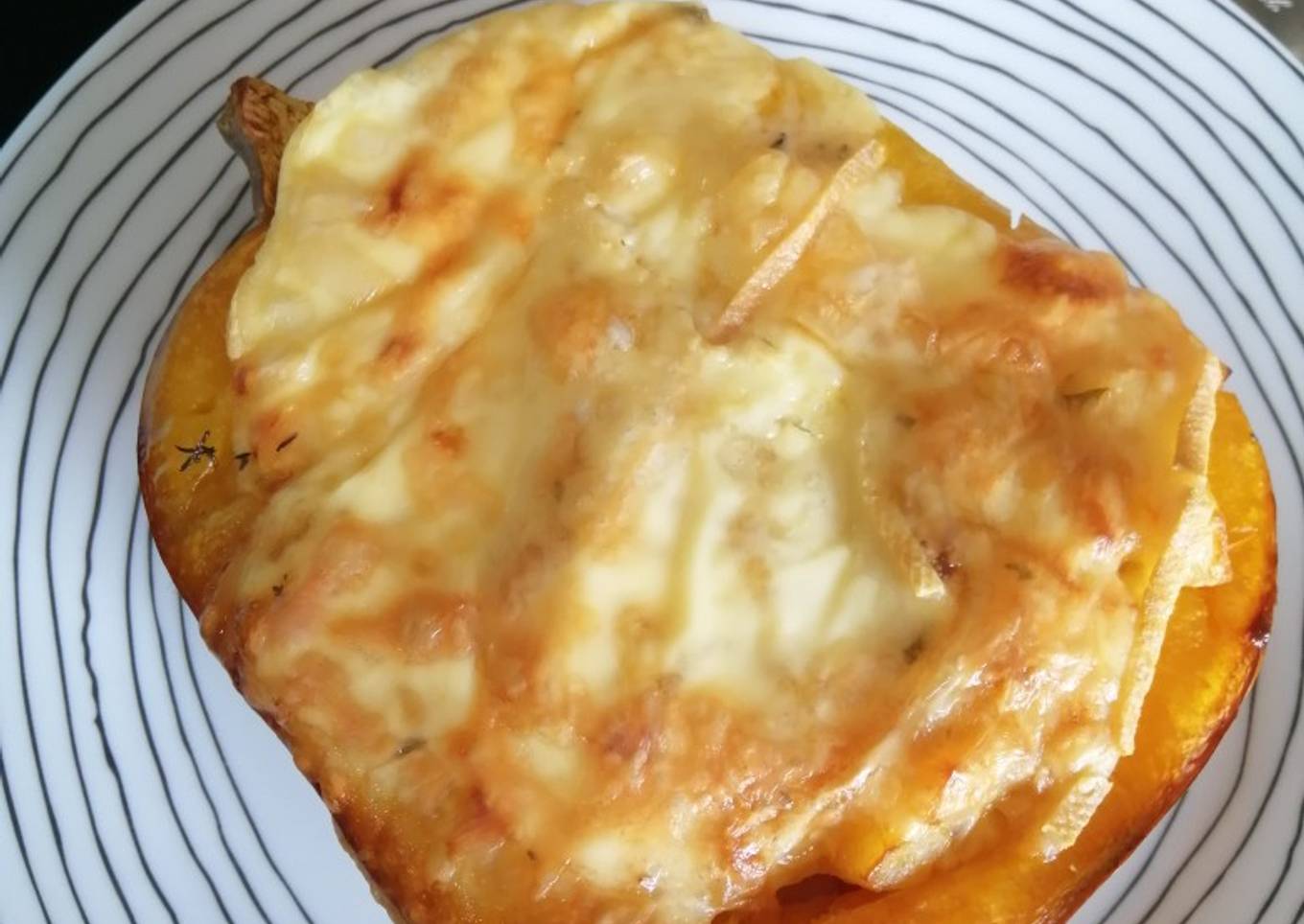- Quand le Butternut est cuit, rajouter dans le creux, le mélange pomme de terre et oignons, 3 tranches de fromage à raclette sur chaques 1/2 Butternut.