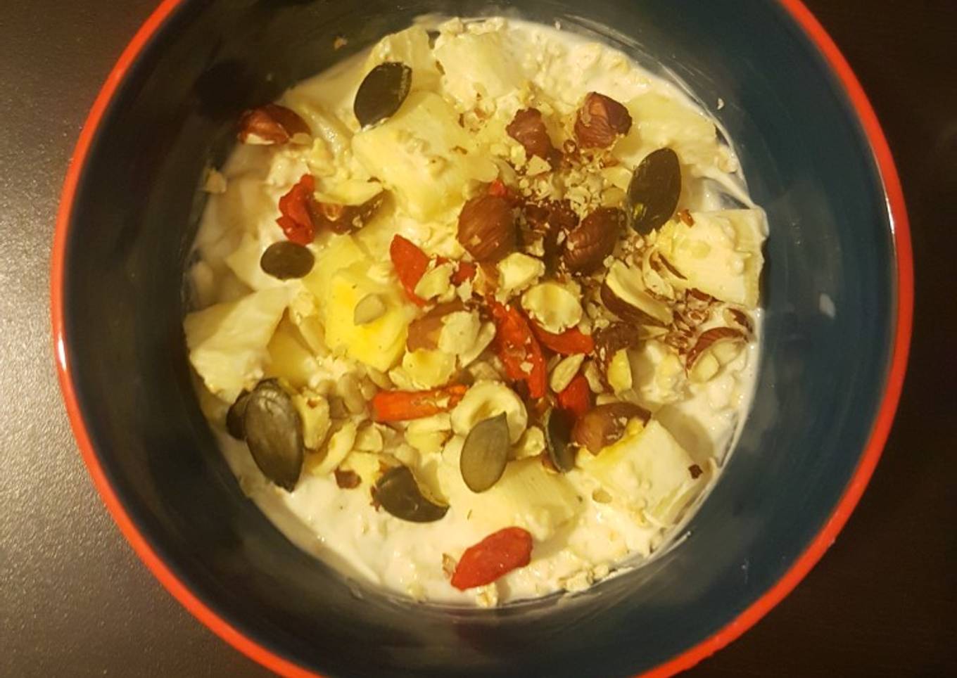 - Topping : baies de goji, noisettes, graines de courge.