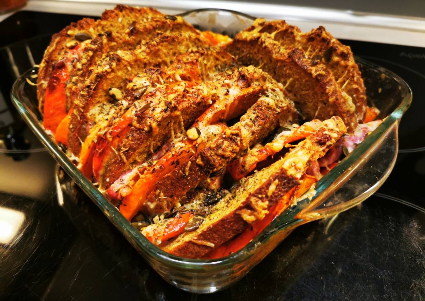 Pain perdu au potimarron, lard et graines de courge