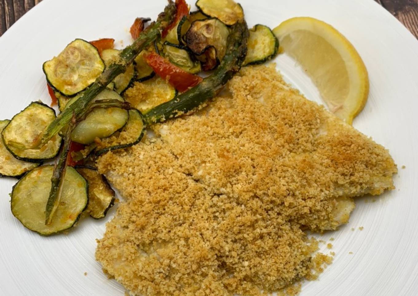 - Passez le poisson sous l’eau et séchez-le avec du papier absorbant. Placez-le dans le plat de légumes et saupoudrez-le de crumble et faites cuire pendant 15/20min (selon le poisson). Dégustez avec un filet de citron !