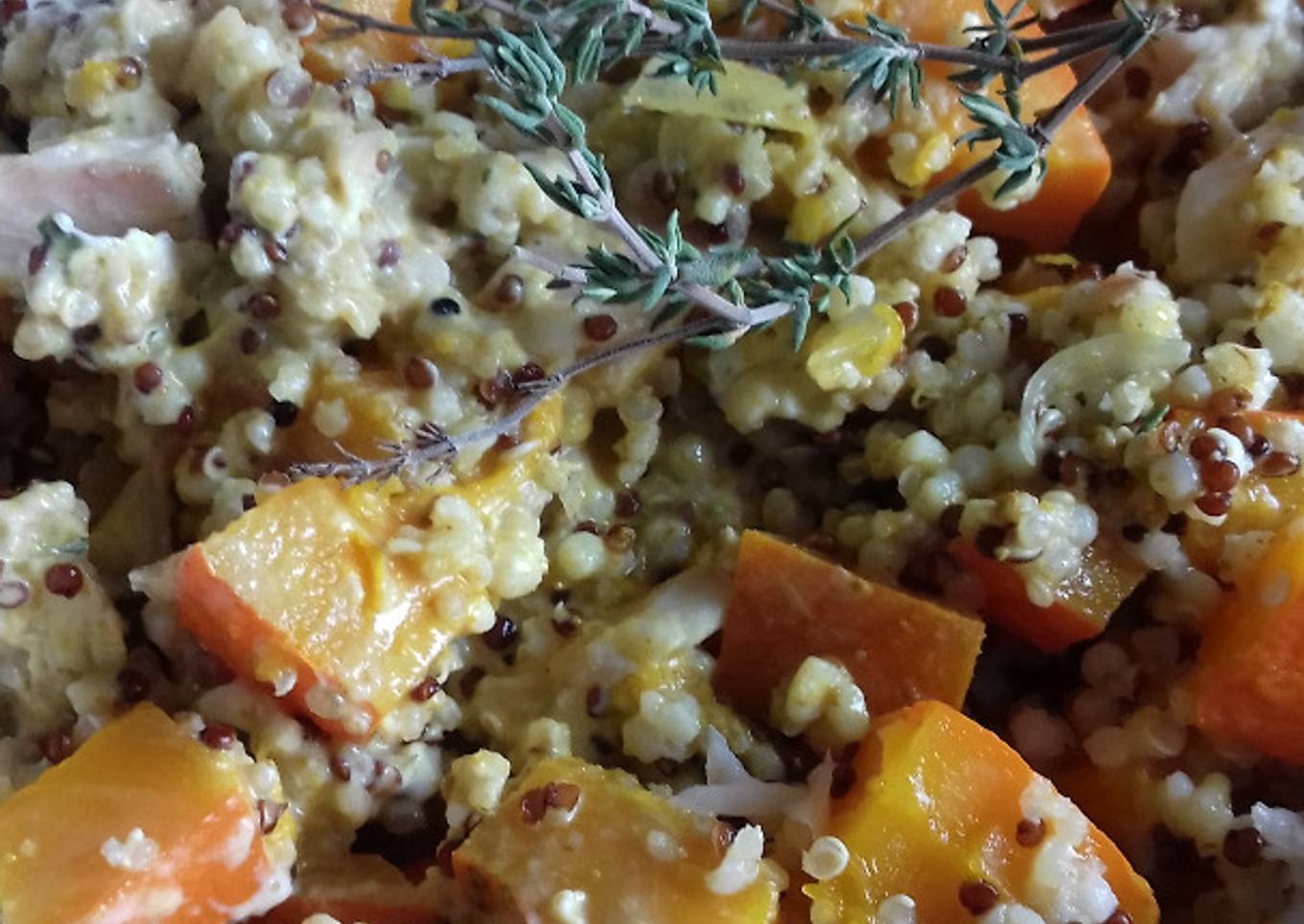 - Faites cuire le quinoa selon les instructions du paquet puis égouttez-le. Versez le dans un plat à gratin. Ajoutez le potimarron, la truite fumée effilochée en lamelles. Puis ajoutez les épices, la crème, mélangez, rectifiez l'assaisonnement.