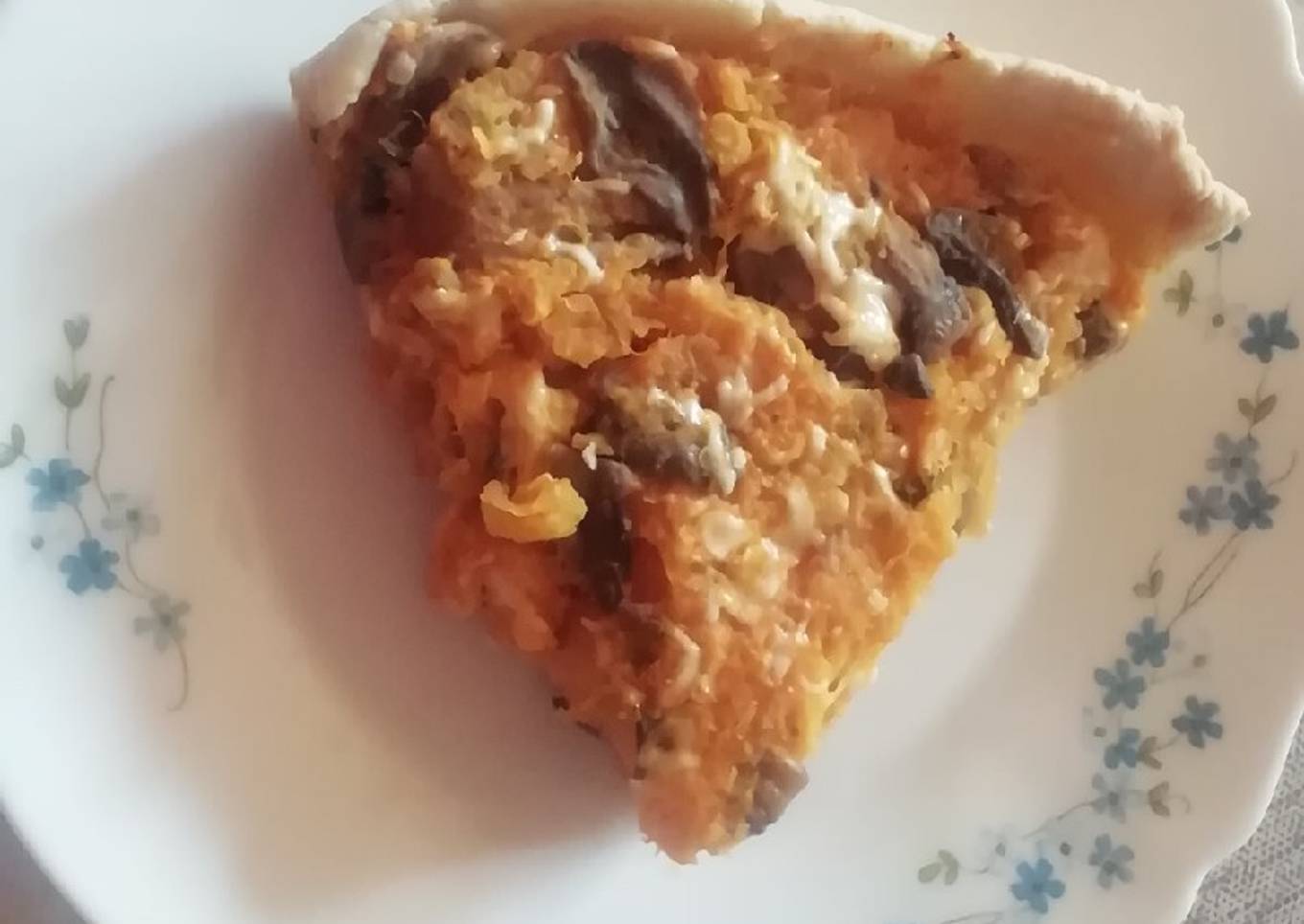 - Écraser le potiron comme pour réaliser une purée. Mélanger le potiron avec les champignons, l'emmental. Ajouter le mélange sur la pâte. Faire cuire encore 15 minutes environ à 180°