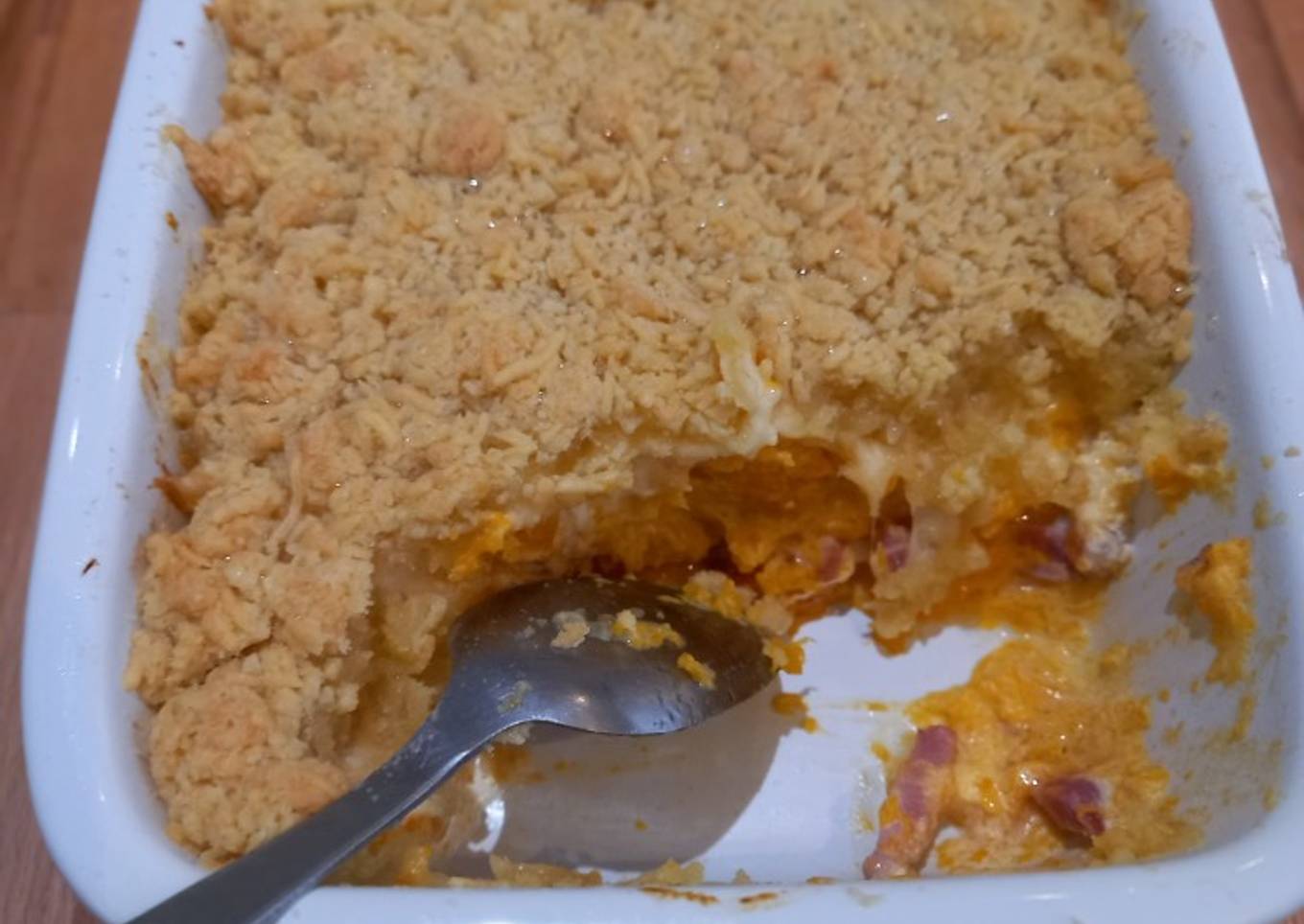 - Prechauffez le four à 190 degrés. Dans un plat allant au four, déposez les morceaux de butternut égouttés, les lardons par dessus et la crème. Salez, poivrez, et melangez avec une cuillère. Émiettez la pâte à crumble par dessus et au four pendant 30-35 minutes, la pâte doit être doré.
