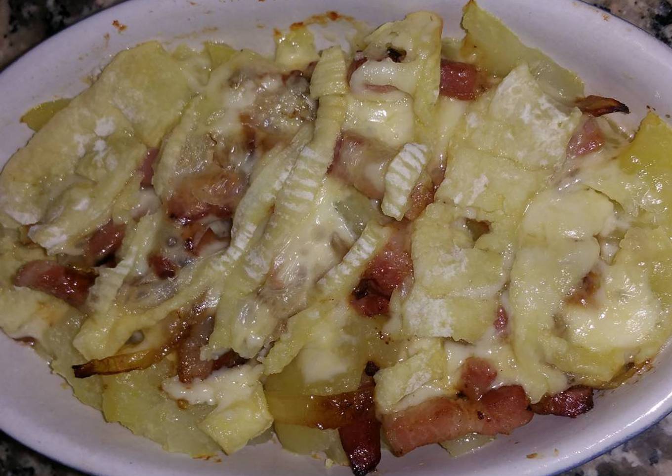 - Faire cuire les pommes de terre à l eau pendant 20 min. A coté faire revenir le demi oignon et les lardons à la poêle. Préchauffer votre four à 200°C pendant 10 min. Dans un plat à four individuel mettre au fond les pomme de terre,le mélange lardons/oignons et arroser d un petit peu de vin blanc. Ensuite mettre les lamelles de fromage à tartiflette sur le tout et enfourner pendant 25 min.